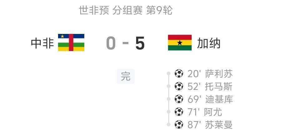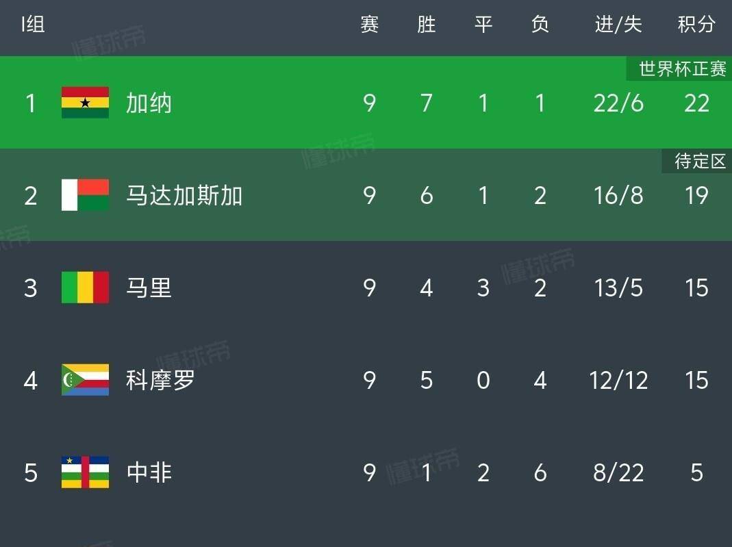 在同一轮世预赛非洲区其他比赛中,加纳队5-0大胜中非共和国,喀麦隆2-0击败毛里求斯,佛得角与利比亚3-3战平。 这些比赛结果决定了各小组的出线形势。 在I组,加纳队凭借这场大胜积累22分,领先第二名马达加斯加3分,几乎锁定了小组头名位置。