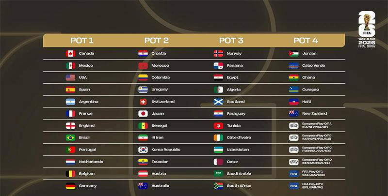 除了东道主和附加赛球队外,其他档次依国际足联排名确定。第一档囊括了西班牙、阿根廷等传统豪门,德国排在该档次的末尾。第二档主要是欧洲实力派球队及亚洲晋级的日本、韩国、伊朗和澳大利亚。第三档多为中游球队,如挪威就位列此档,令球迷既期待又紧张。第四档包括首次参加世界杯的新秀如约旦、佛得角和库拉索,此外像实力较强的加纳也位于此档。
